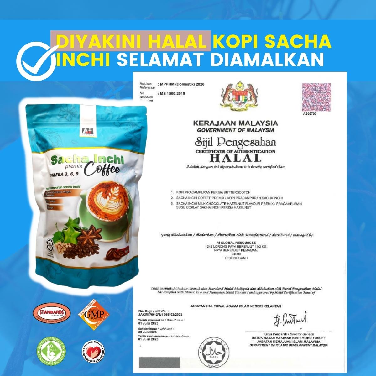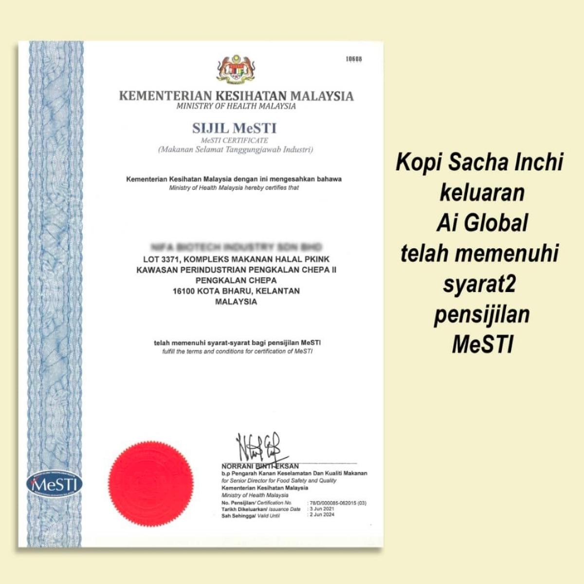 YA semestinya ada. Kami juga berdaftar dengan Badan Makanan ( MeSTI ) dan Kopi Sacha Inchi dihasilkan dari Kilang Bertaraf GMP. Selamat diamalkan tanpa ragu-ragu dan was-was.